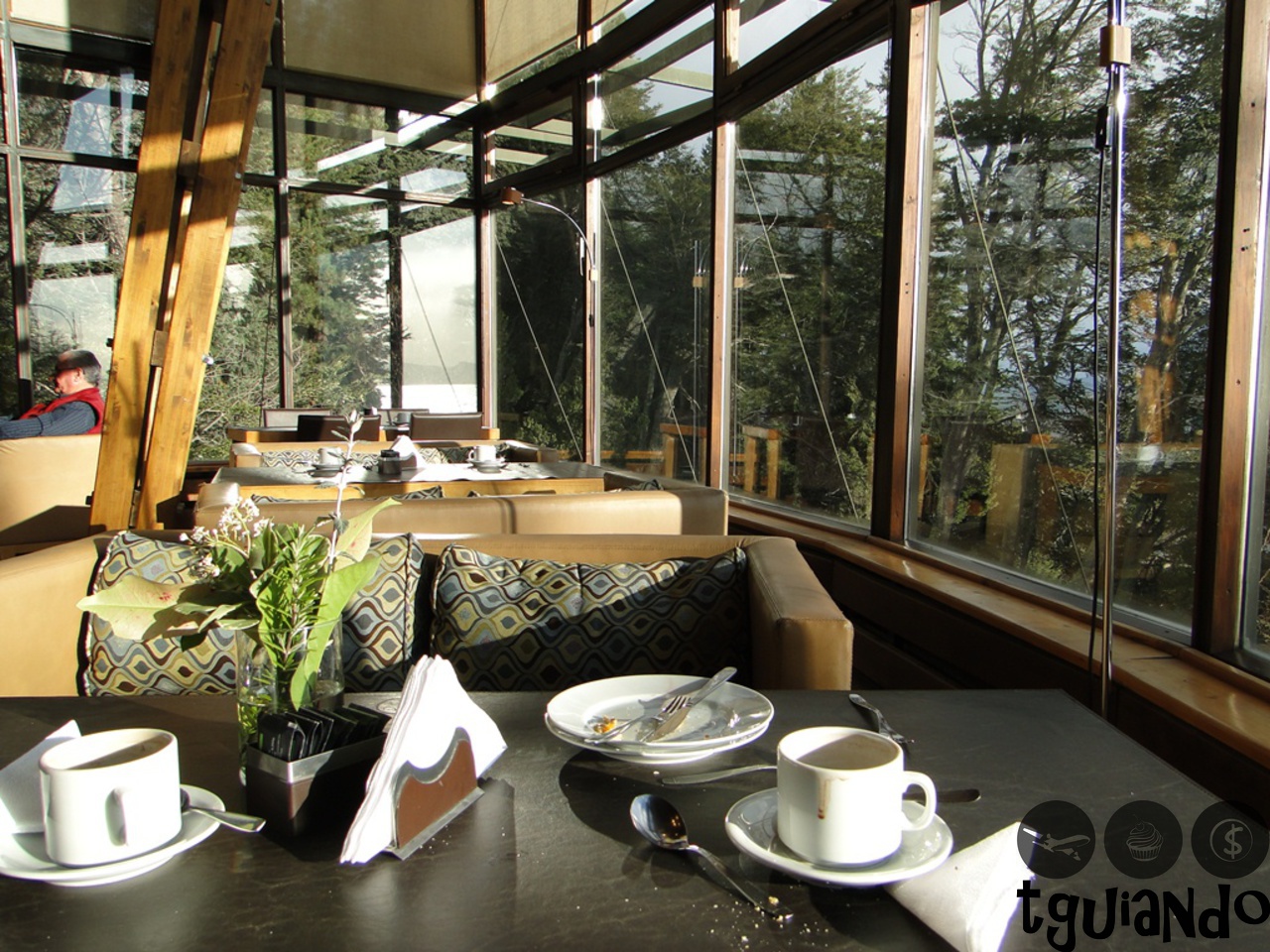 O café da manhã conta com bolos, frutas, sucos, frios, doces e uma vista incomparável para o lago Nahuel Huapi
