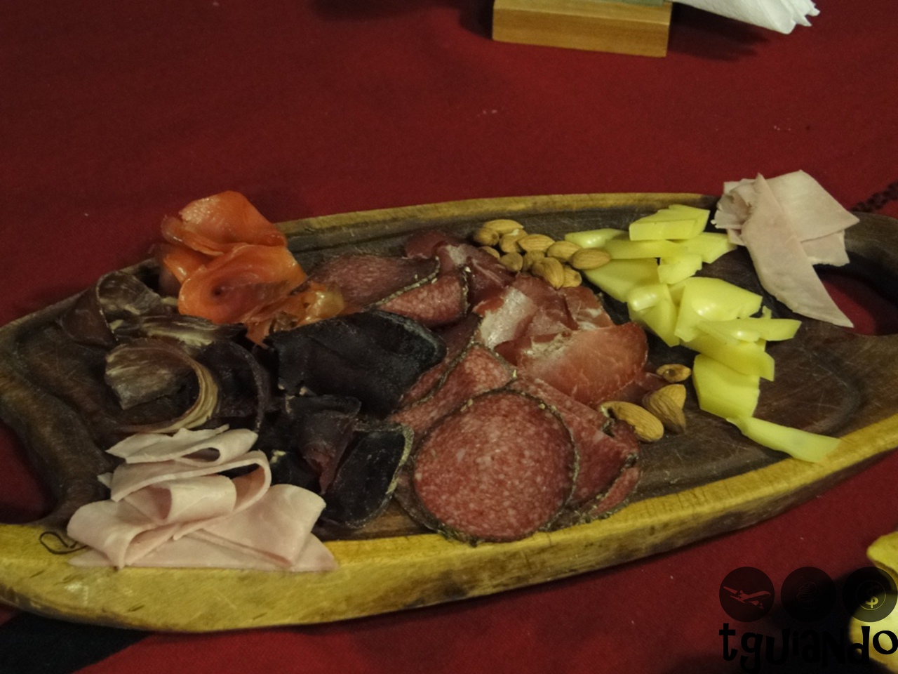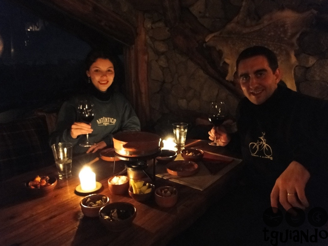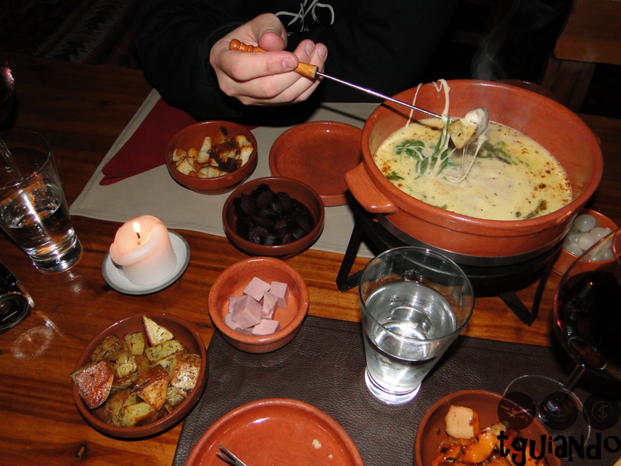 Para começar, uma providencial sopa de espinafre para esquentar as mãos e o corpo e depois uma diferente massinha. Mas o melhor ainda estava por vir, o fondue de queijo com diversas guarnições: salsicha, salsão, presunto, cebola em conserva, maça verde, crouton, verduras no azeite, batatas e ravióli crocante.