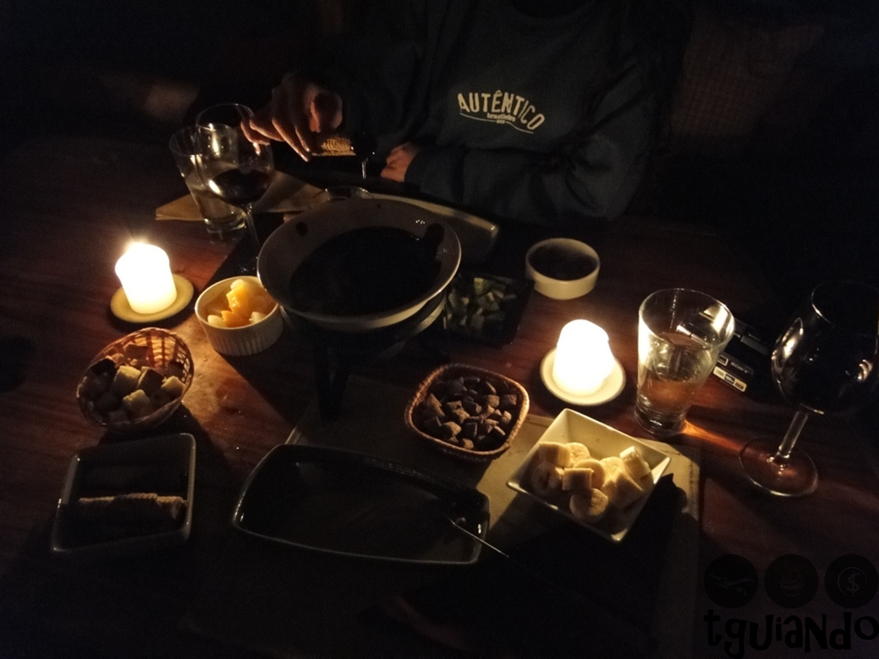 De sobremesa,  fondue de chocolate com doce de leite. Para acompanhar: kiwi, banana, bolo caseiro com amêndoas, pêssego e abacaxi, cubanitos, biscoitinho de cereais e guinda.