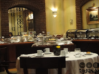 O café da manhã era muito bom, tanto na quantidade quanto na variedade de bolos, pães, tortas, frutas, frios e sucos.