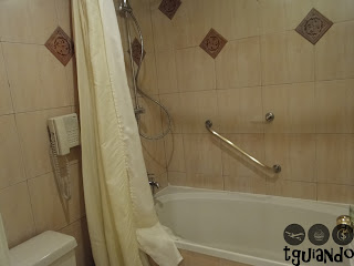 Apesar da suíte ser ampla e bem decorada, no banheiro tinha uma banheira pequena e cortina.