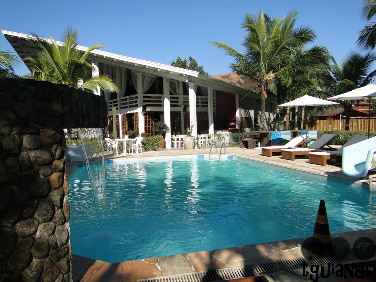 Antes de sair para a praia, tiramos algumas fotos à beira da piscina, que, com o sol, ainda mais bonito.