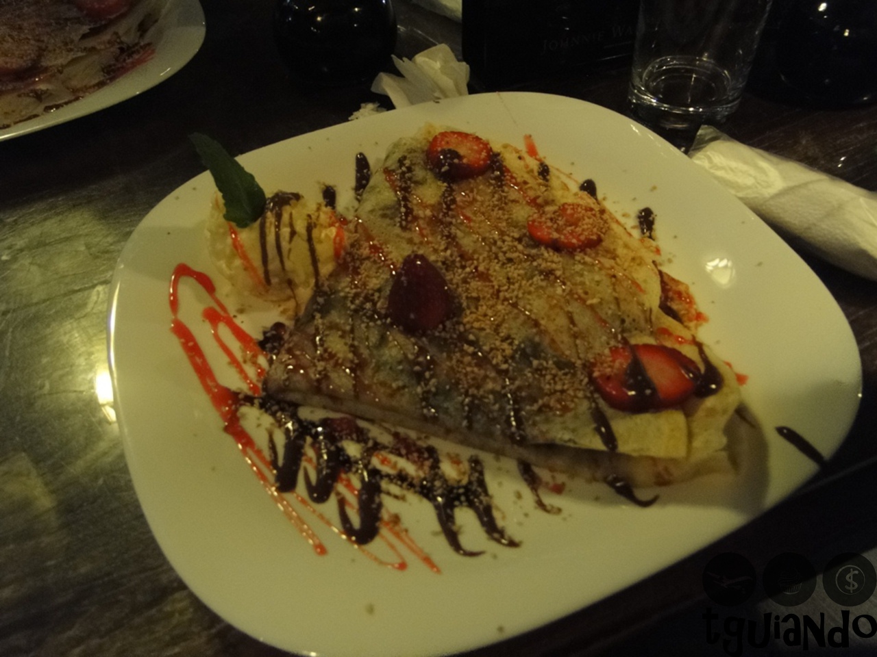 A creperia que estávamos procurando fechou, mas encontramos outra. Foi nesse ambiente agradável que escolhemos onde comeríamos a sobremesa: crepe de chocolate com morangos.