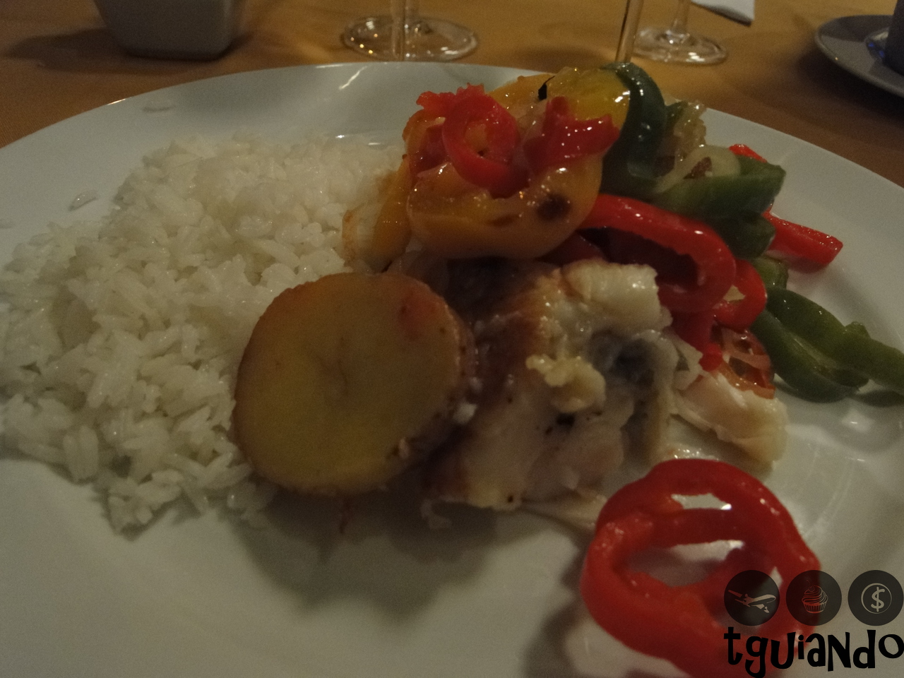 Não foi fácil a escolha do prato principal, uma vez que o cardápio possui opções como filé mignon à parmegiana, picanha do portuga, PF Lusitana, joelho de porco, bacalhau e meca caiçara. Mas já que estamos em um restaurante português, o prato escolhido não poderia ser muito diferente de bacalhau. Optamos pelo Bacalhau à Narcisa, que é servido com batatas, pimentões, azeitonas pretas e cebola, e acompanha arroz. O prato custou R$ 90,00 e serve bem 2 pessoas.