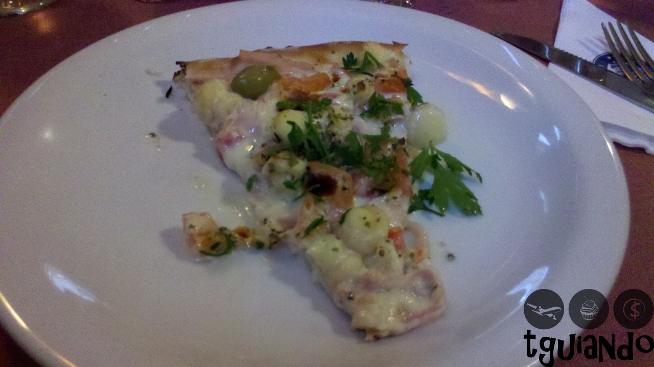 Groupon (pizza grande + jarra de vinho: R$ 33,90) + 2 águas + 1 suco + 3 sobremesas + taxa de serviço = R$ 85,93