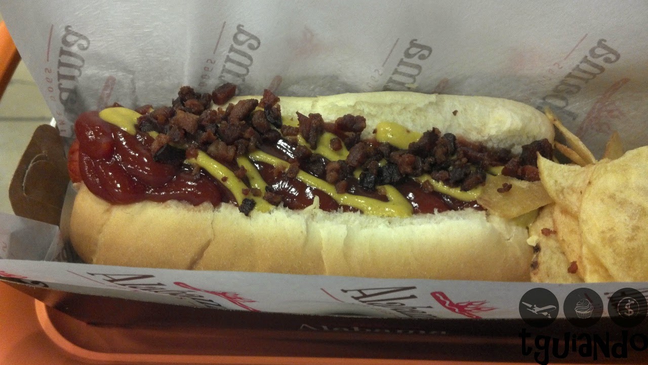Pedimos um Tradicional (pão hot dog caseiro, maionese tradicional, salsicha americana, catchup e mostarda clara) e um Italiano (pão hot dog caseiro, maionese tradicional, salsicha americana, molho de tomate caseiro com manjericão, queijo parmesão ralado e batata palha).