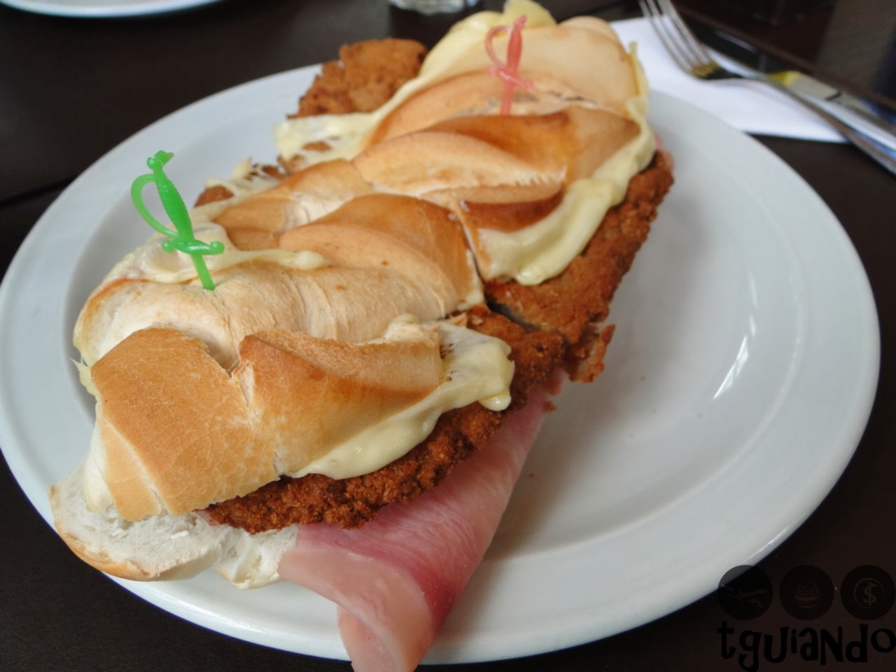 Não sabíamos como seriam os lanches, escolhemos pelo nome do cardápio e fomos surpreendidos quando nos serviram. Pedimos uma hamburgesa (parecido com o nosso cheeseburger, pão com gergelim, hambúrguer, queijo e presunto) e uma milanesa (pão tipo francês, bife à milanesa, queijo e presunto).
