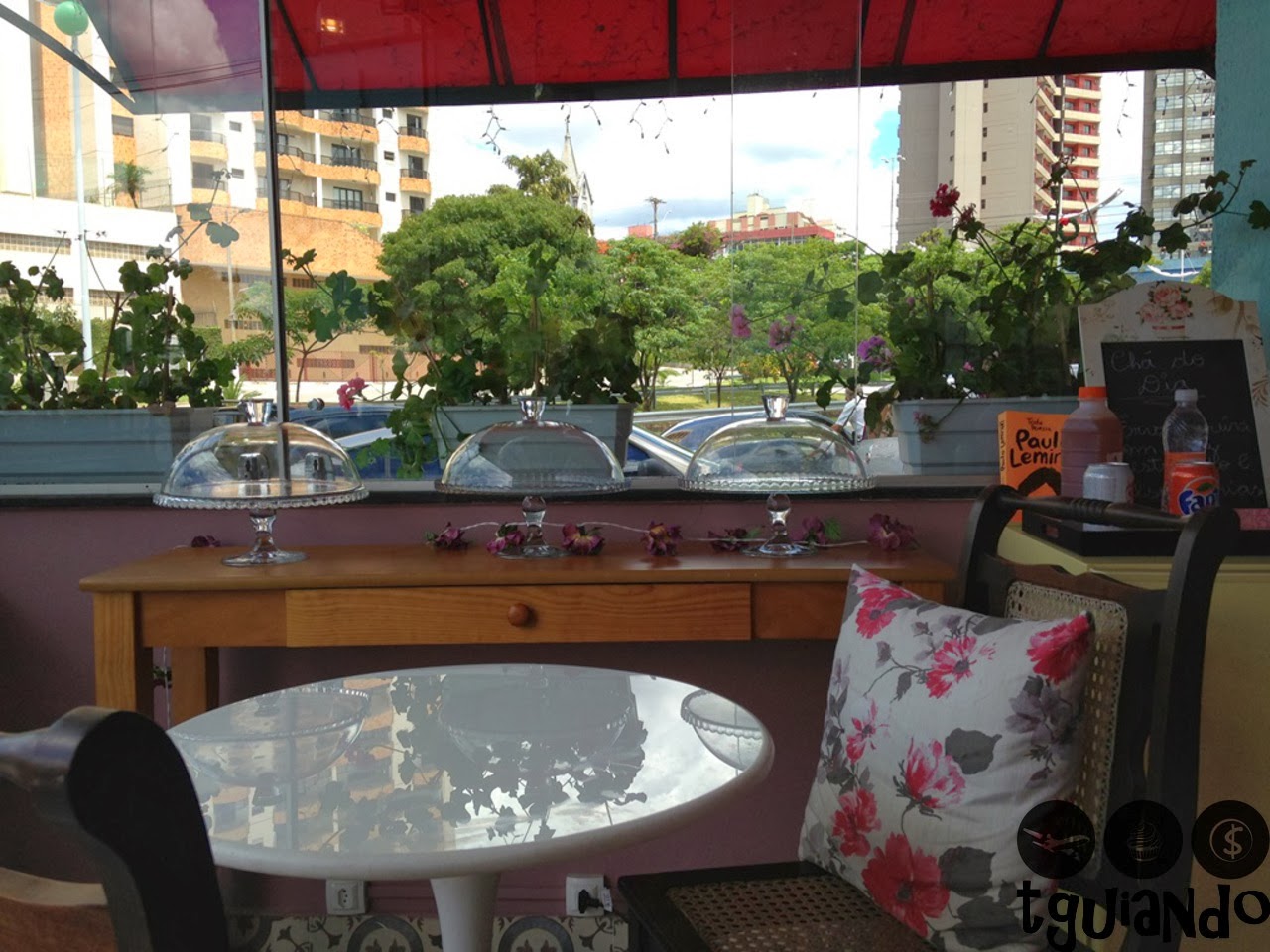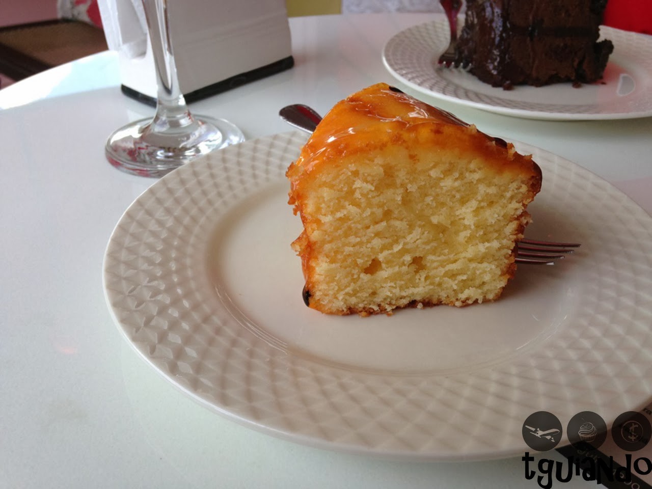 Em um ambiente pequeno, porém confortável e bem arejado, é possível fazer uma pausa para um café e degustar da sua fatia de bolo preferida cortada na hora. Assim fizemos. No dia não tinham muitas opções, então pedimos de maracujá e chocolate.