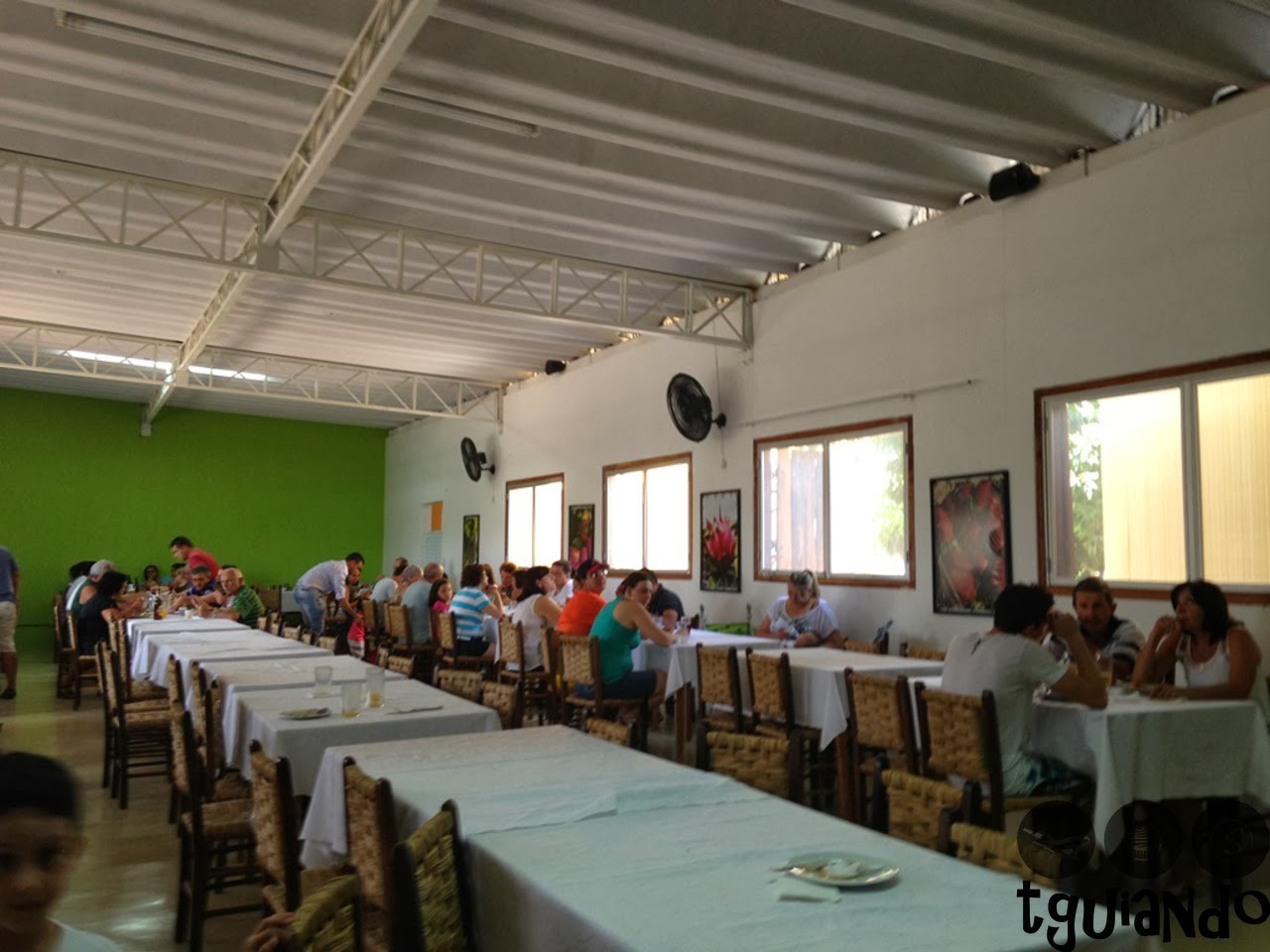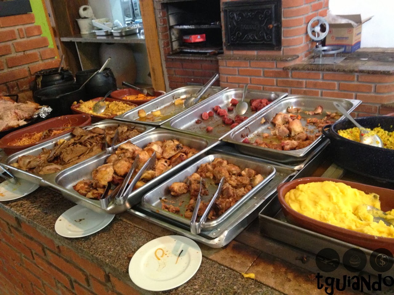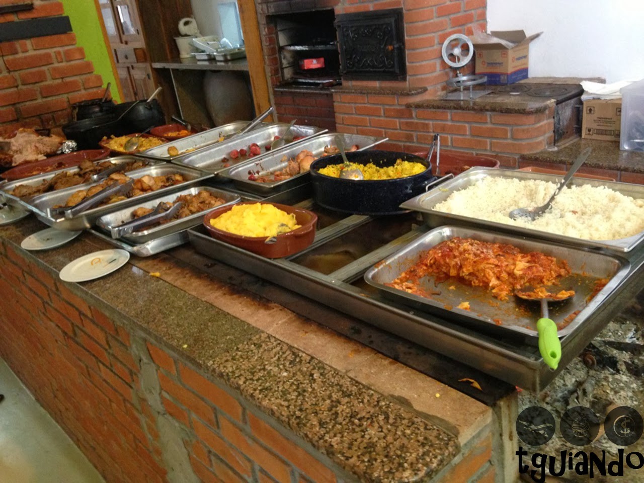 O restaurante possui três salões com mesas para o almoço e, entre eles, está o buffet de comidas frias (saladas) e o fogão à lenha com deliciosos pratos.