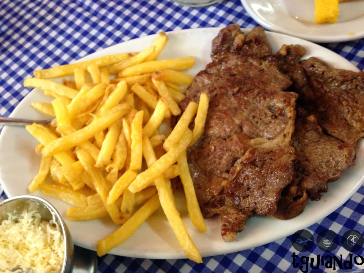 Para os pratos, pedimos: frango milanesa (empanado e frito em pedaços), contra filé com fritas e arroz, polenta mole, polenta frita, risoto de carne.