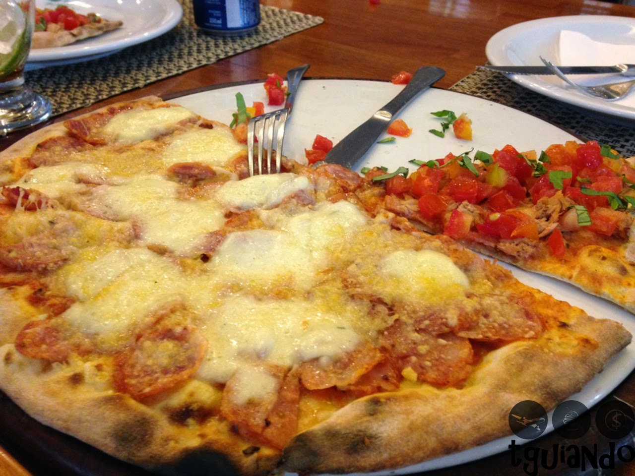 Para beber, pedimos suco, refrigerante e chopp. E a escolha da pizza foi meia-meia, Tradição (molho de tomate, mussarela, atum, cebola e azeitonas pretas) e Scala (molho de tomate, calabresa artesanal tipo italiana, mussarela fresca de búfala gratinada com parmesão).