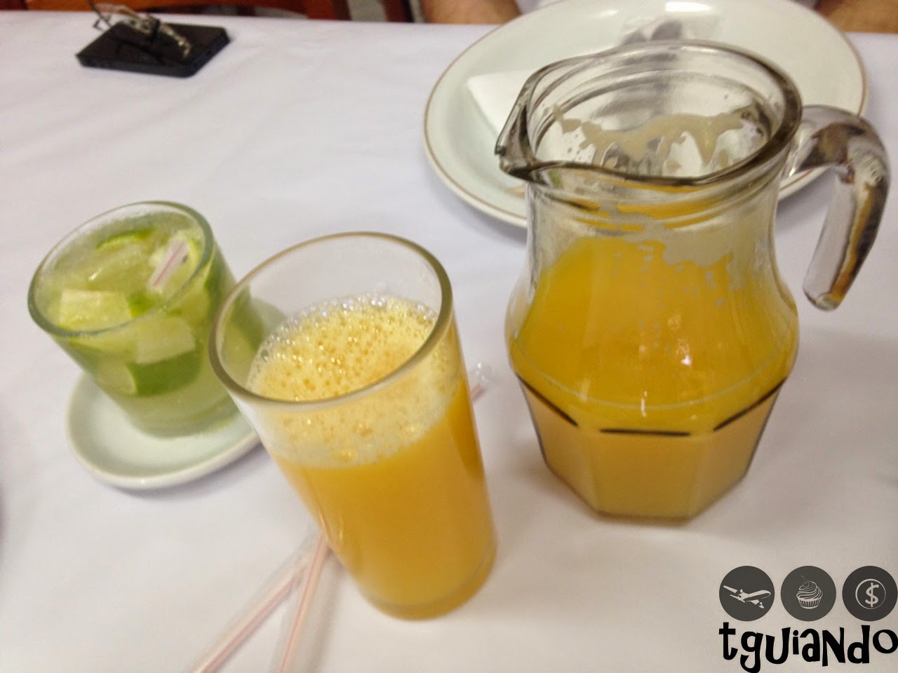 Pedimos uma caipirinha e uma jarra de suco de laranja.