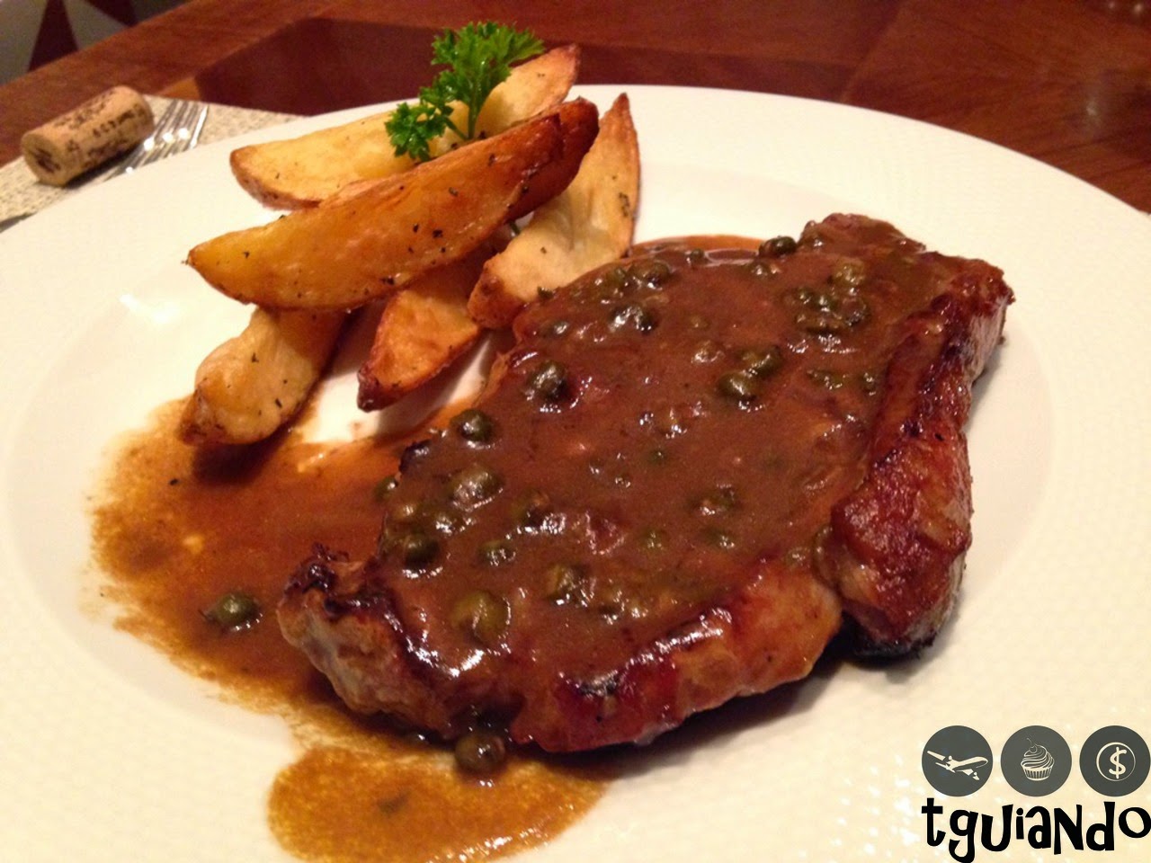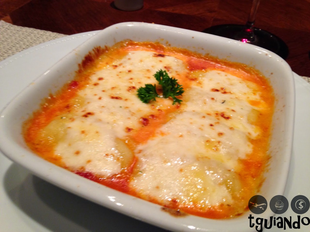 Não lembrava do que tinha comido da outra vez, fiquei na dúvida e acabei pedindo o mesmo prato. Pelo jeito é o que mais me chamou a atenção no cardápio. Pedi Gnocchi Maremonti (recheado com queijo brie e mozarella, ao molho de tomates frescos e molho bechamel, gratinado ao forno) e o Rafa, Chorizo Al Pepe (bife chorizo ao molho de pimentas acompanhado de batatas rústicas).